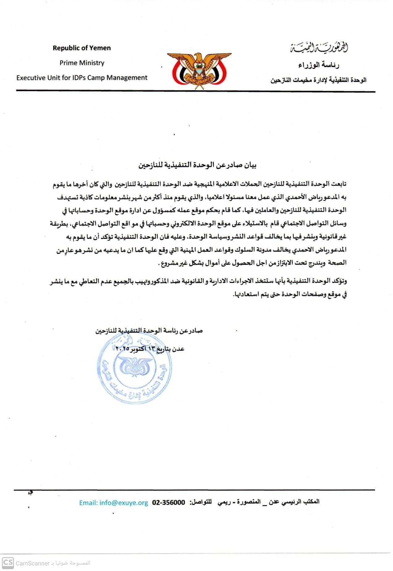 - الوحدة التنفيذية للنازحين ترد على حملة تضليل إعلامي وتتوعد باتخاذ الإجراءات القانونية